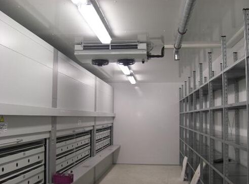 (一)、工程概述及本次設計范圍:1、醫藥冷庫:1間 外形尺寸(LxWxH)m: 4m×5m×2.6m 庫內溫度2-8℃ (二)、制冷系統: 本工程采用氟利昂(R22)制冷系統的制冷工質.氟利昂系統壓縮機采用風冷壓縮機組 (3p)2套 冷庫平面圖